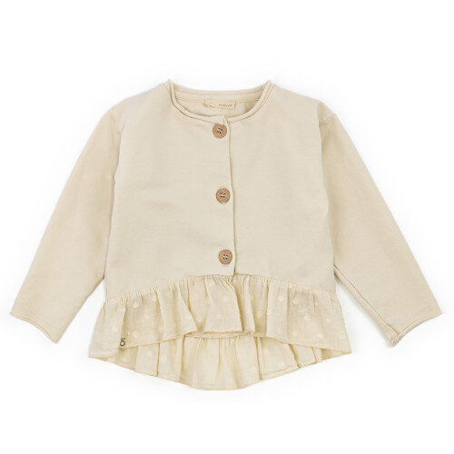 Design: La felpa presenta un design con maniche lunghe e apertura frontale con bottoni. La linea è semplice e pulita, con dettagli femminili.